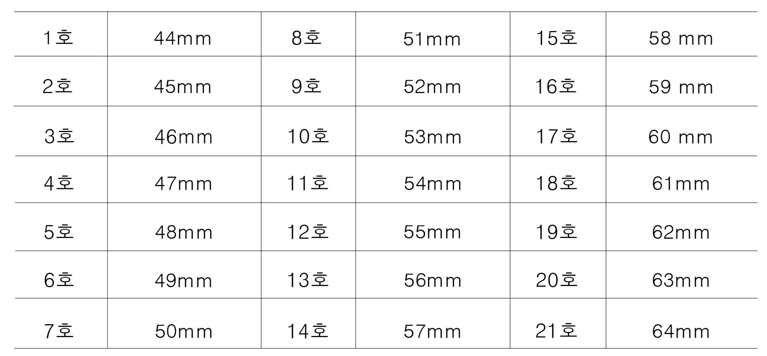 -줄자 혹은 종이나, 실로 손가락 사이즈를 측정하여 아래의 사이즈 표에서 맞는 길이의 반지 호수를 확인해주세요.